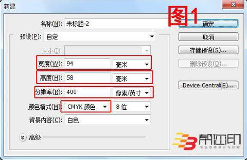 打開Photoshop,新建一個文檔,規(guī)格尺寸設(shè)置為寬度94MM,高度58MM,分辨率400,顏色模式CMYK,然后點擊確定。如圖1所示。