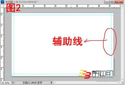 2、  在新建文檔中顯示標(biāo)尺(視圖—標(biāo)尺),然后拖拉輔助線,把出血用輔助線標(biāo)示出來,如此,設(shè)計的時候才有一個清晰的設(shè)計范圍哦。如圖2所示。有時為了輔助線的準(zhǔn)確性,可以放大圖像進行拖拉輔助線,相對會準(zhǔn)確好多。