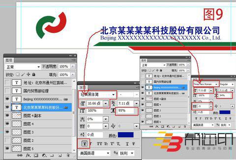 9、 然后在如圖9所示位置放上自己公司名稱,字體大小如圖中所示,或者根據(jù)自己公司名稱長短靈活設(shè)置字體大小、顏色、字符間距、英文名稱字體大小等等。